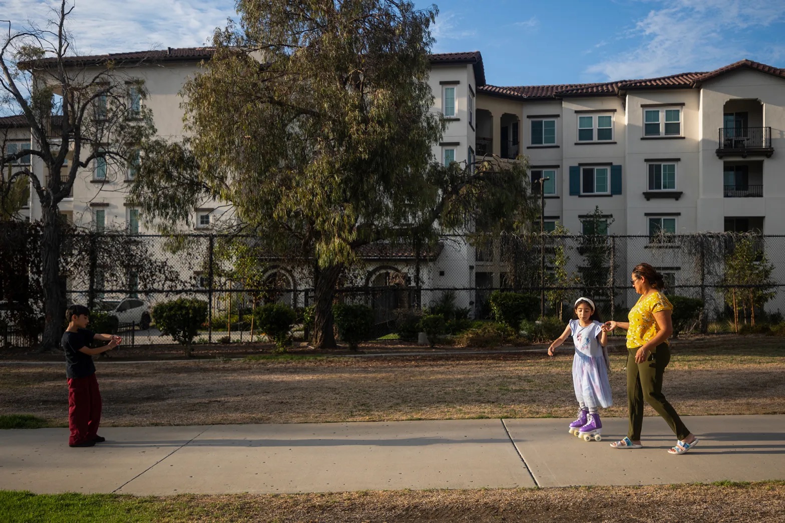 First: Carolina Sanchez Garcia helps her daughter Berthalinda Hernandez, 6, put on roller skates at their home in San Diego on Aug. 7, 2024. Last: Carolina Sanchez Garcia walks with her daughter, Berthalinda Hernandez, 6, and son Kanye Hernandez, 9, at a park near their home in San Diego on Aug. 7, 2024. Photos by Zoë Meyers for CalMatters